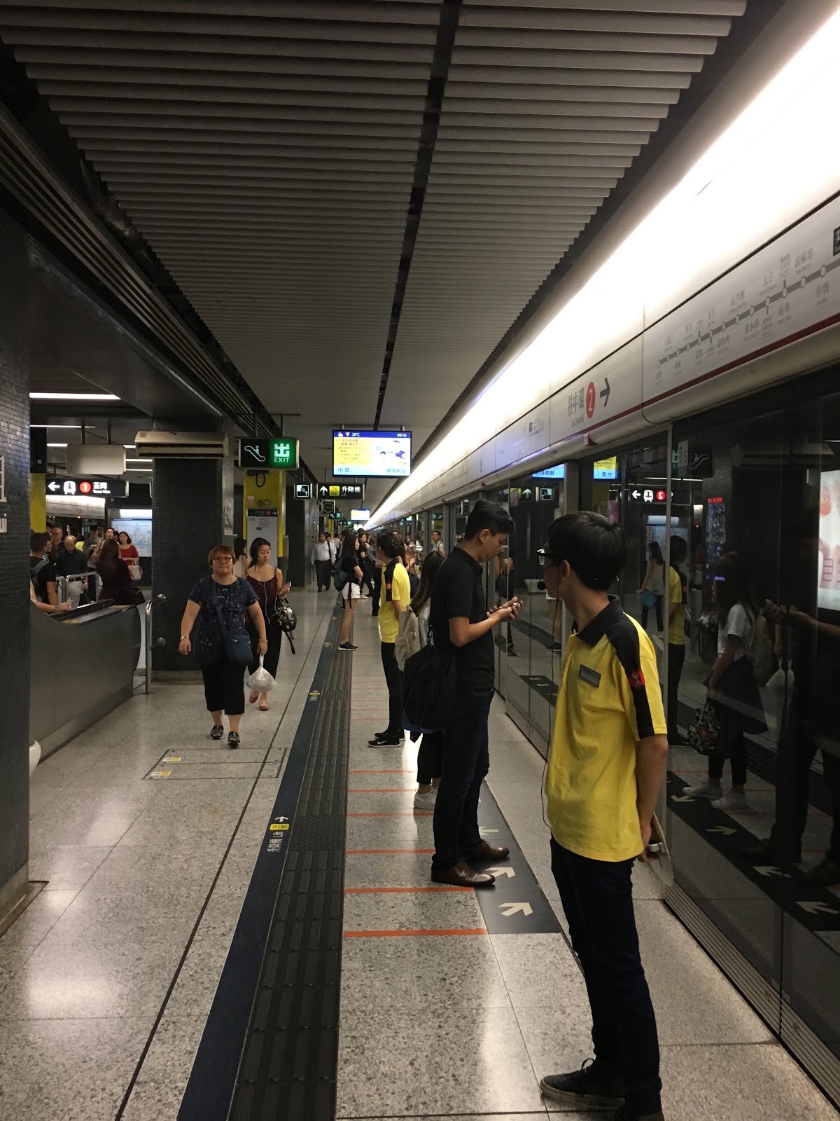 写真は朝の通勤時間のホームですが、全部のドアに安全監視員がついてました。香港の人はドアの周りから動かない人も多いのでドア周りはとても混雑するみたいです。