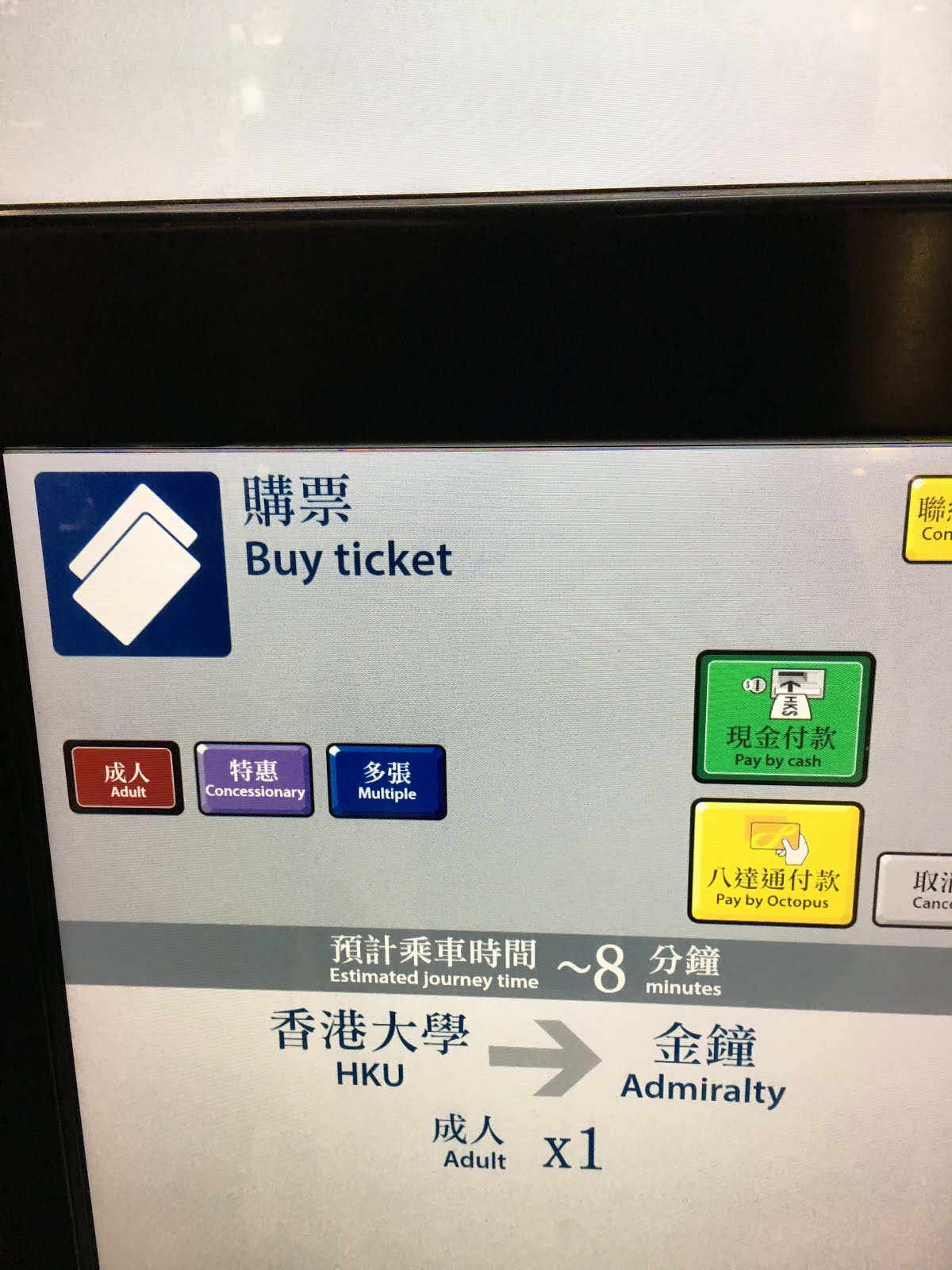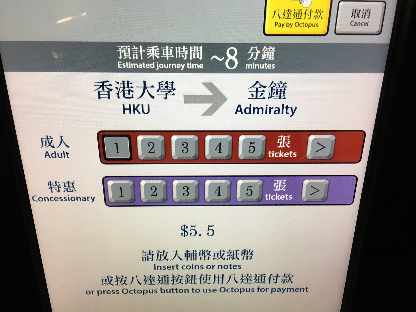 写真の香港大学から金鐘で4区間分なのですが、大人一人で5.5香港ドルです。なんと約90円弱しかしません。香港でのちょっとした移動はMTRを使うととってもお得です。