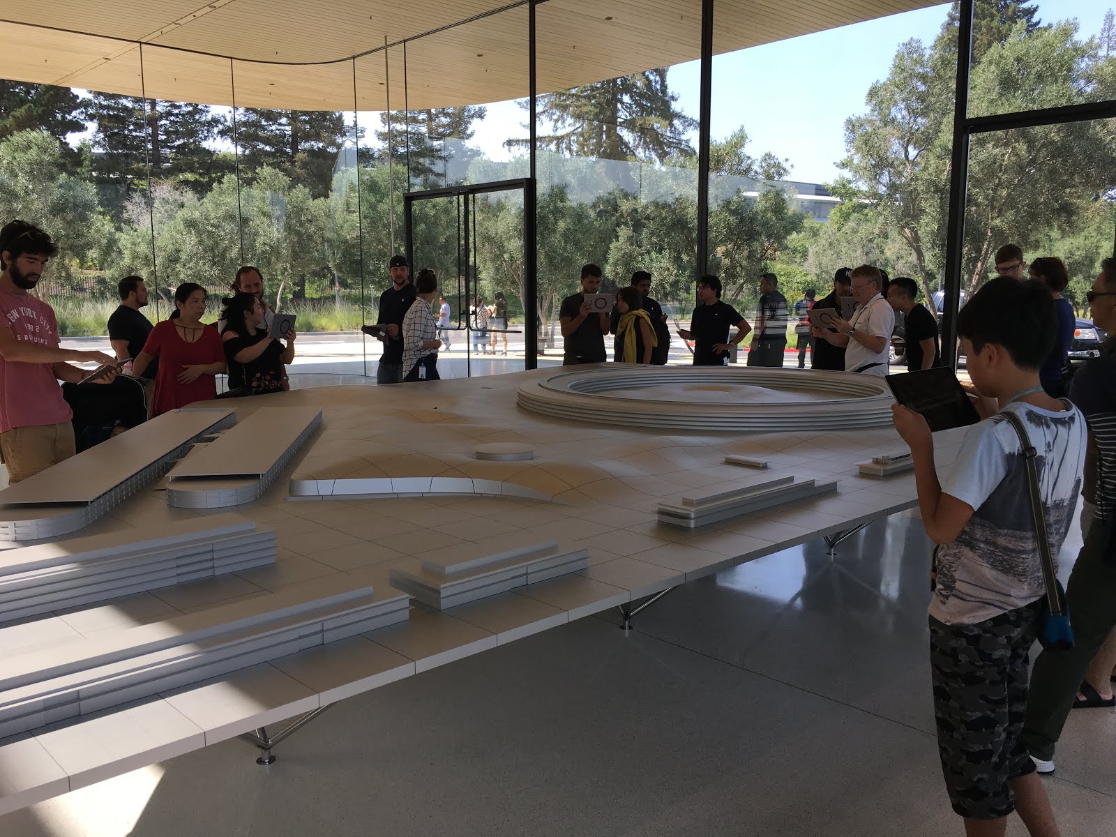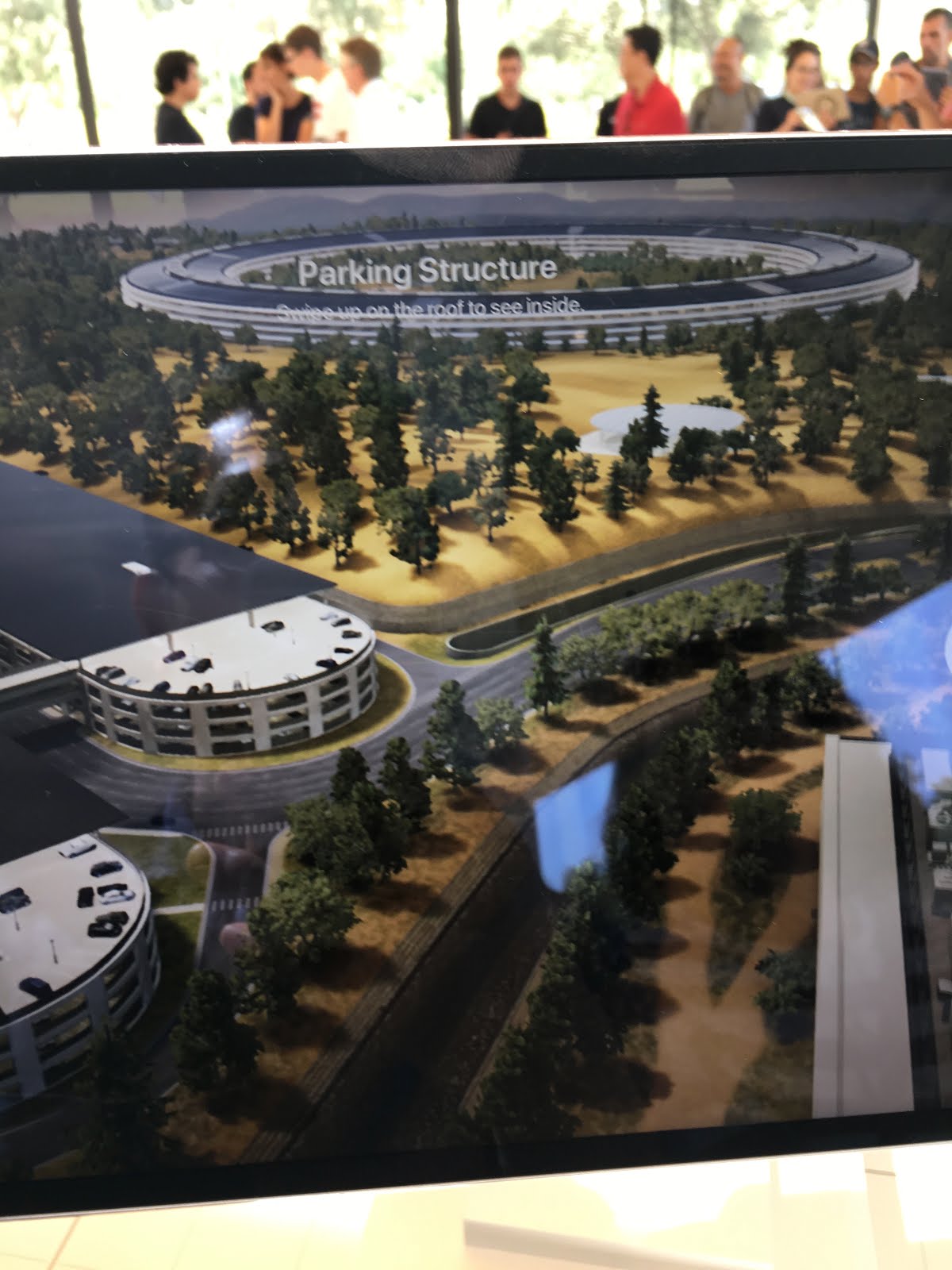 また、アップルパーク全体の模型?がおいてあり、専用ARアプリをインストールしたiPadをスタッフから受け取ると、それぞれの建物の中を覗くことができたりします。なかなかの人気ですが、すぐに飽きちゃう人もいるので順番はすぐ回ってきます。